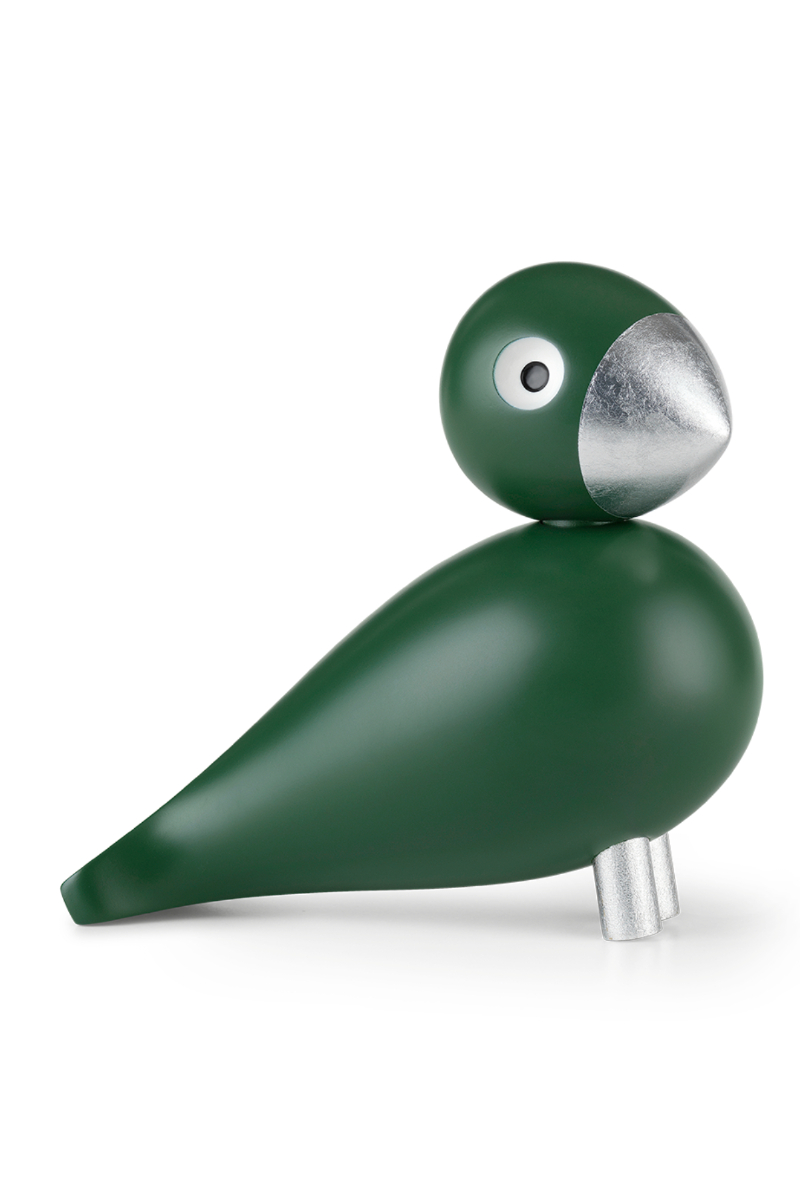 Vakker sangfugl i mørkegrønn med nebb og bein kledd i bladsølv. Sangfuglen er fra Kay Bojesen og er døpt ”Sangfuglen Georg” som en hyllest til Kay Bojesens læretid som sølvsmed hos Georg Jensen, der han hadde praksis i 1910. Den vakre grønne nyansen og de fine detaljene i sølv er inspirert av gamle sølvsmykker fra denne tidsperioden, og passer perfekt sammen med de andre sangfuglene fra Kay Bojesen.