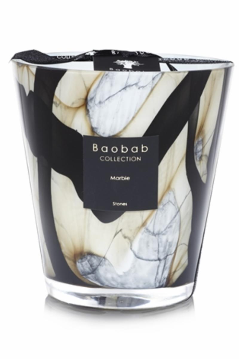 Baobab Collection Max 16 Stones Marble. Det duftende stearinlyset er presentert i en håndblåst glassholder som skal replikere grå marmor med svarte streker kantet med beige. Glassets eleganse avslører flammen, noe som gir en effekt av en lysende stein. Lysets duft er en mystisk blanding av lær og tuberose som perfekt utgjør Marble Stones dobbelte personlighet, både feminin og maskulin.