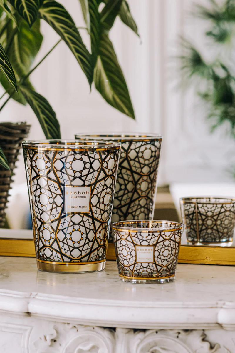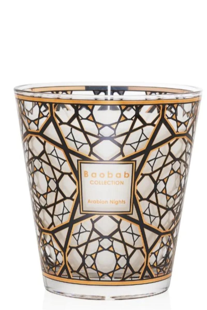 Arabian Nights duftlys tar oss til den mystiske verdenen i Midtøsten. Med glass skjermtrykt med 9 karat gull, henter den sin inspirasjon fra de berømte moucharabieh, åpne arbeidsmotiver som finnes i arabisk arkitektur. Gjennom glasset kommer flammen til syne når den skaper en omsluttende skygge.