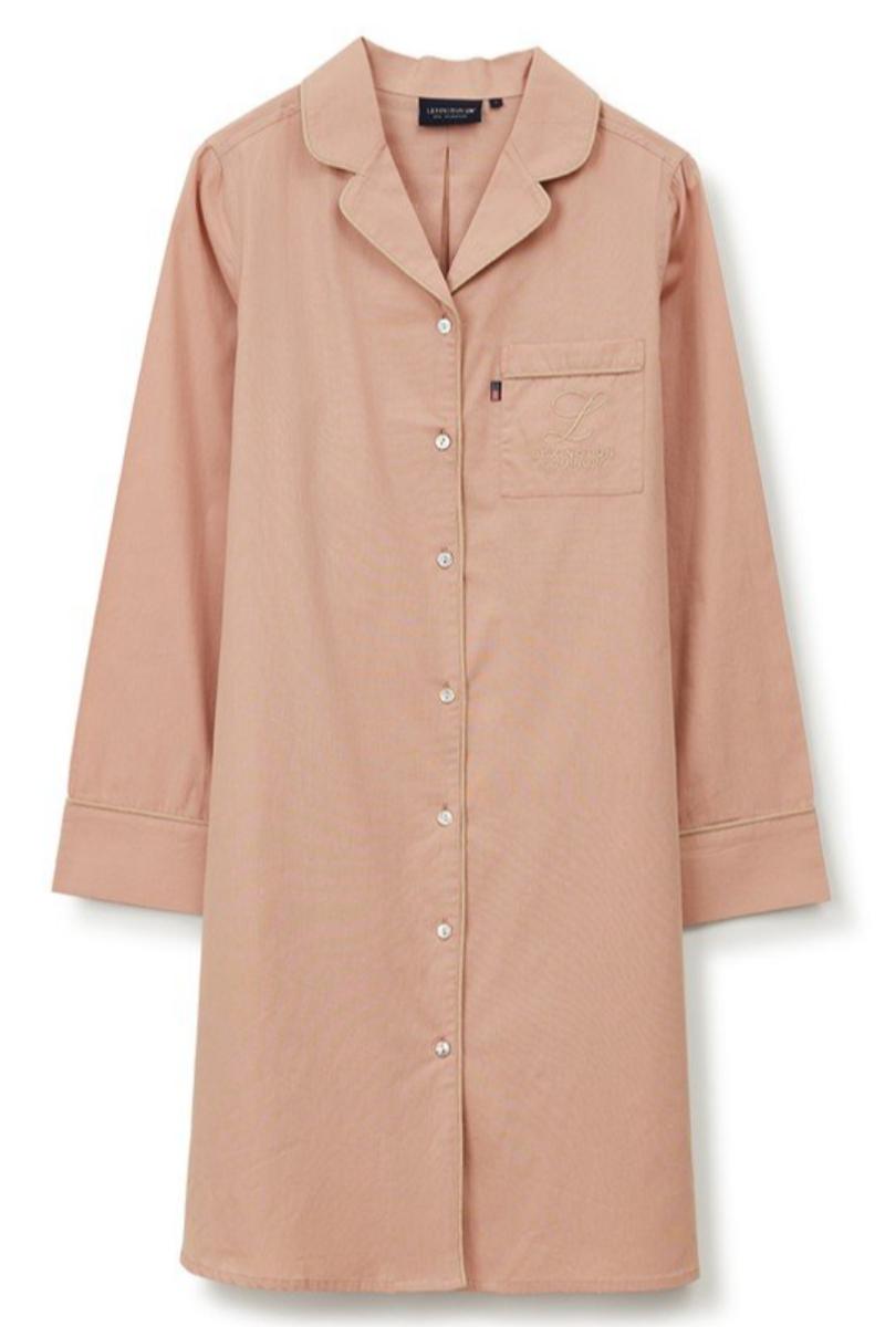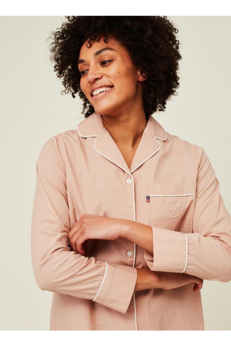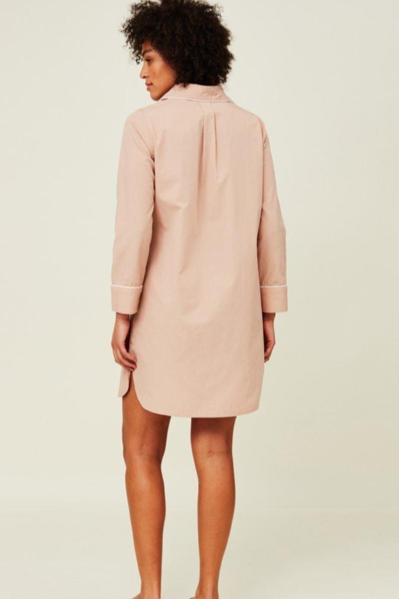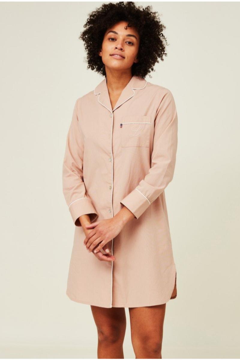 Denne nattskjorten i ren økologisk bomull har en delikat rosa nyanse med pyntesnor i hvit kontrastfarge flere steder. Nattskjorten har poplinvev, knappelukking og brystlomme med merkenavnet brodert i kontrastfarge.