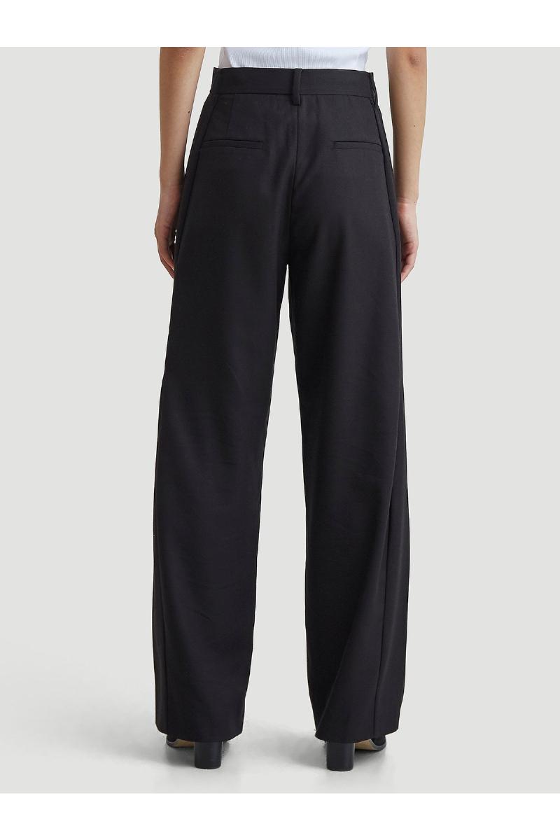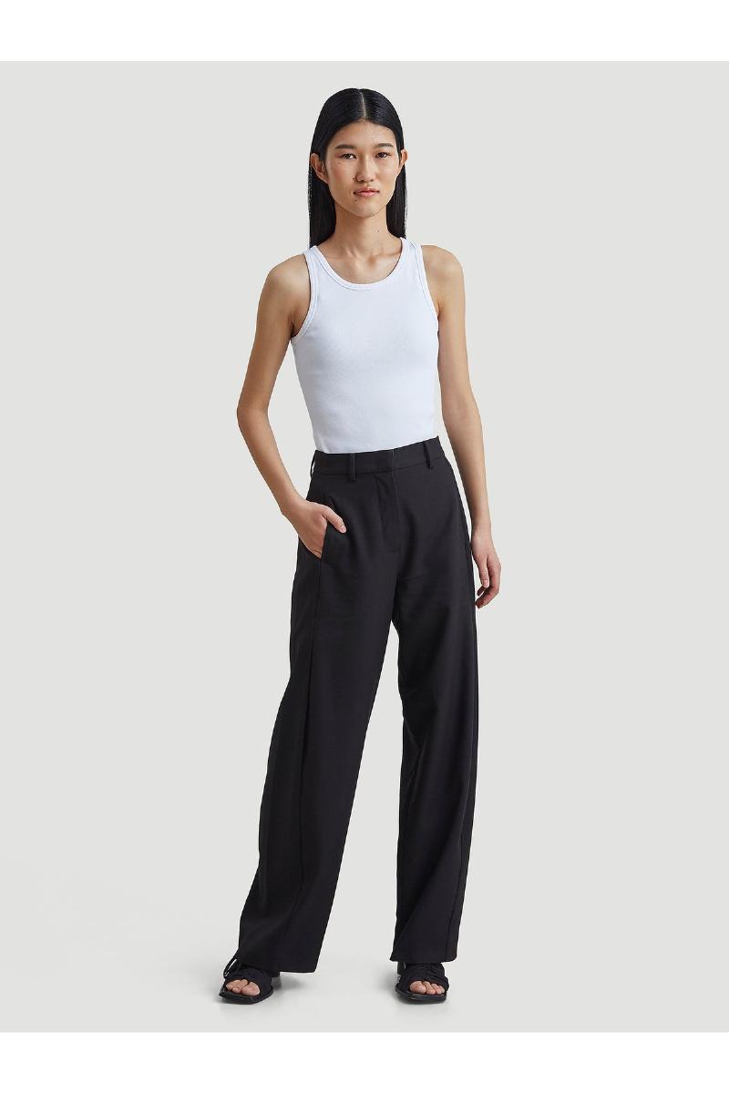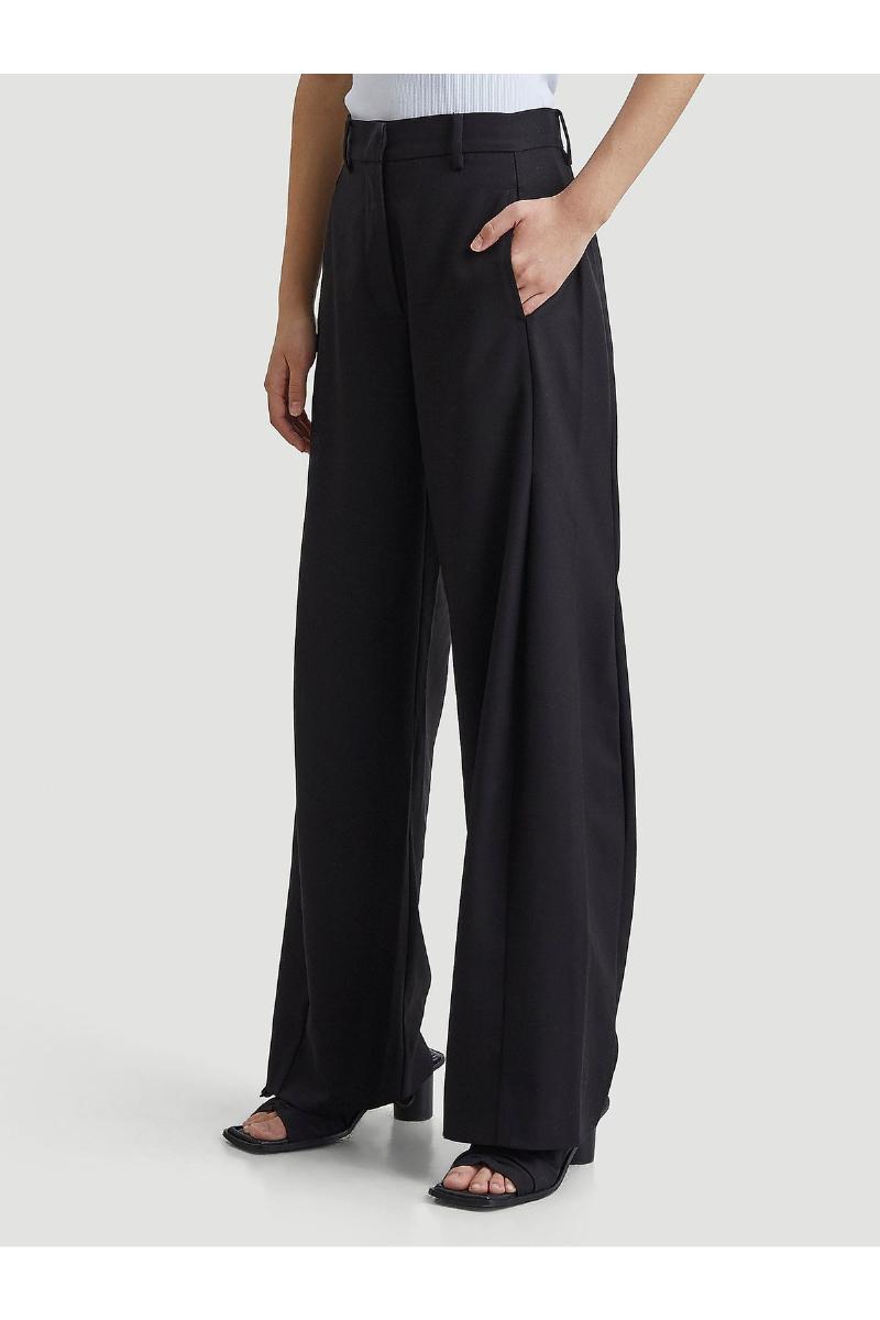 Vidda Trouser er et par bukser med brede ben fra Holzweiler. Buksene kommer med en pleat foran og bak på benet, stikk i lommene i sidesømmene og doble welted baklommer.