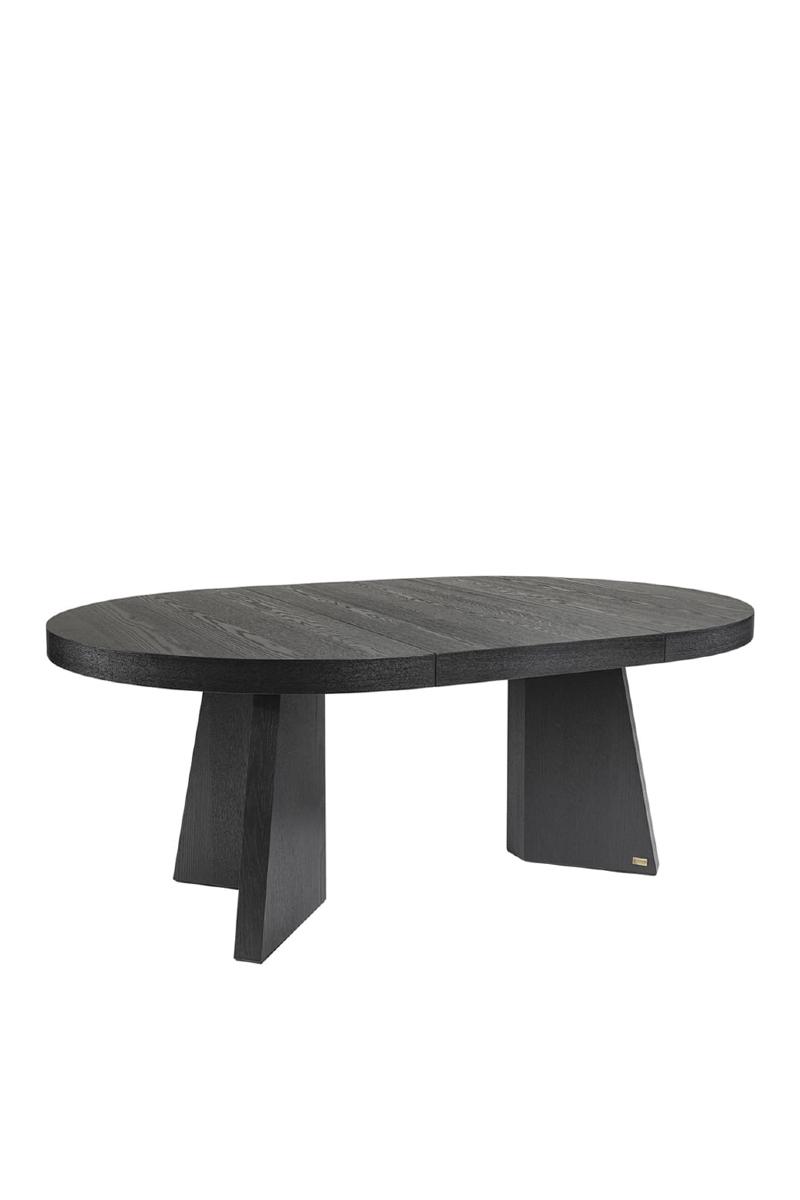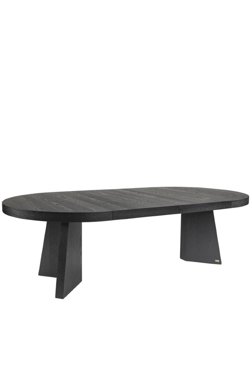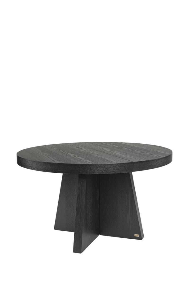 Spisebord i sort eikefiner. 2 st ileggsplater på 60 cm hver følger med. Diam 130 cm, og høgde 75 cm. Bordet blir derfor 190 cm med 1 stk ileggsplate, og 250 cm langt med 2 stk ileggsplater.