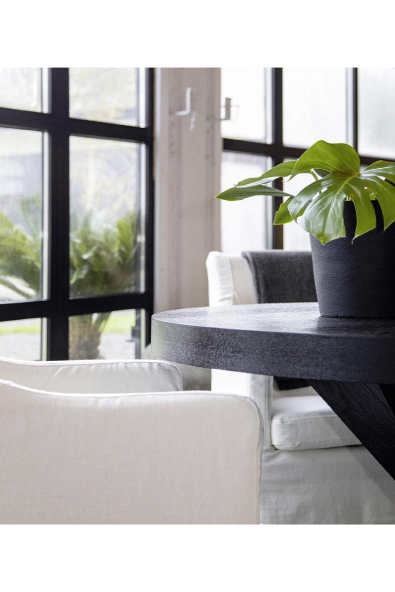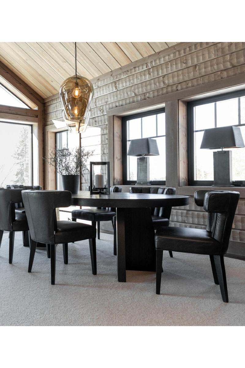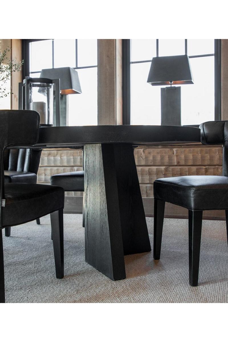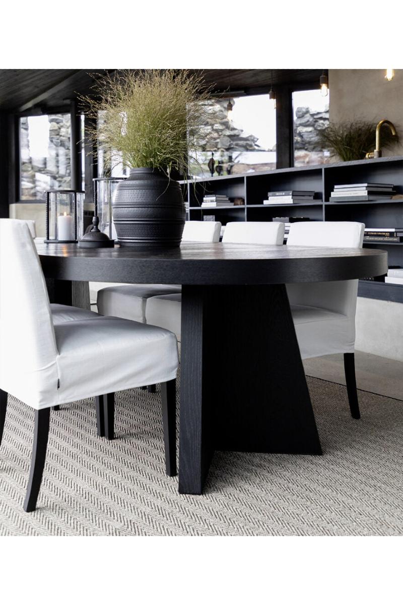 Spisebord i sort eikefiner. 2 st ileggsplater på 60 cm hver følger med. Diam 130 cm, og høgde 75 cm. Bordet blir derfor 190 cm med 1 stk ileggsplate, og 250 cm langt med 2 stk ileggsplater.