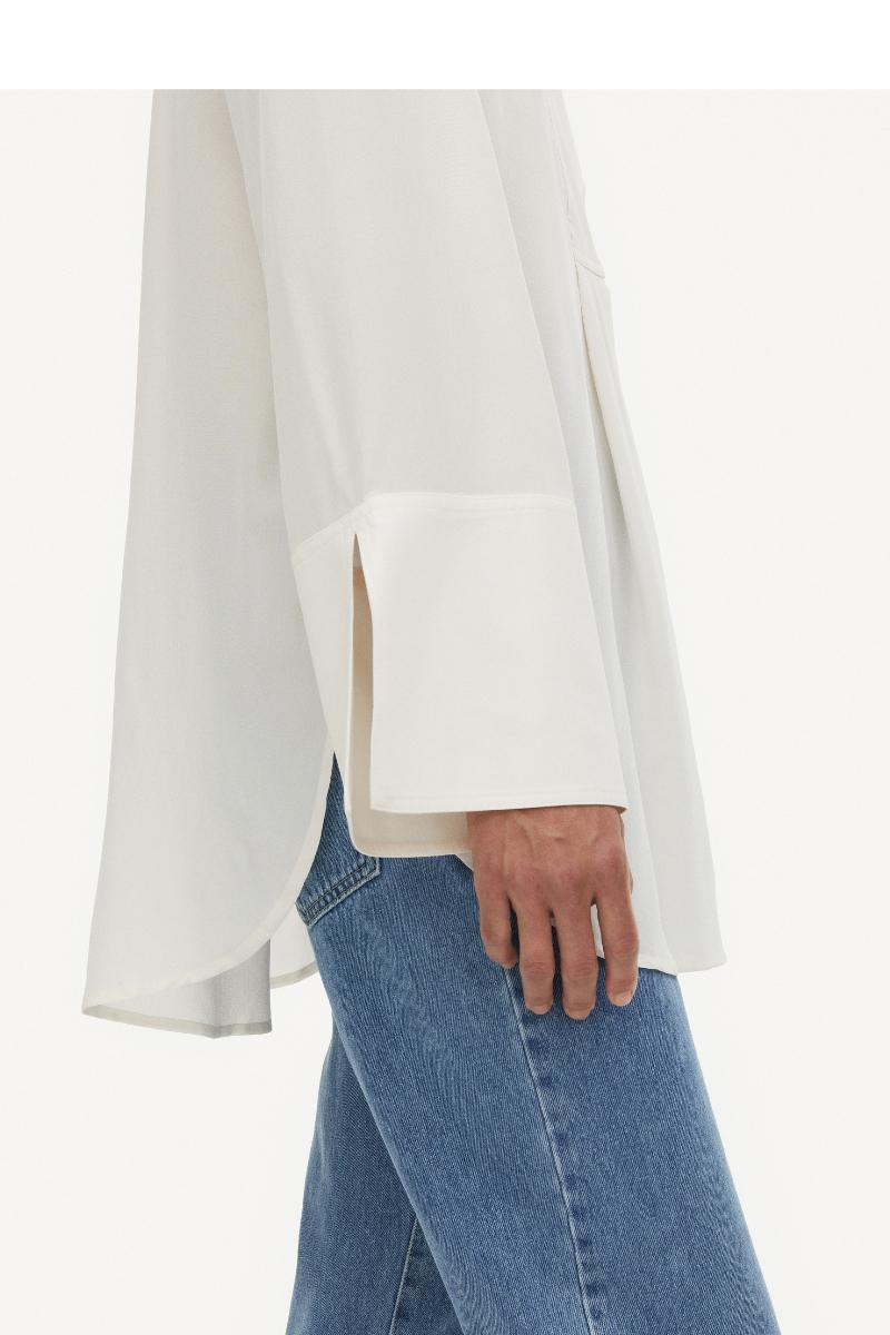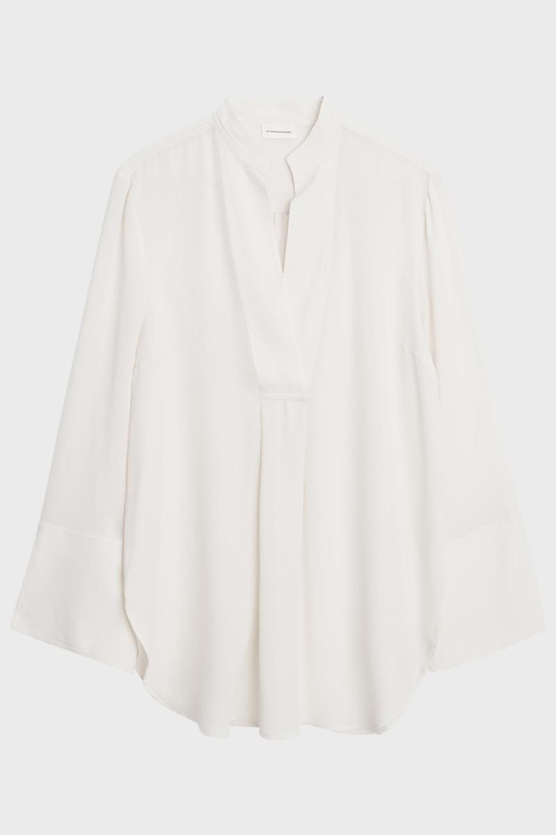 La de gjennomtenkte linjene til Flaiy-blusen gi et raffinert inntrykk av bohemen til hverdagen din. Designet er laget av flytende silke til en løstsittende silhuett, og har brede ermer og en kunstig buet kantlinje. Fremhev den smarte kragedetaljen ved å style den med tilbaketrukket hår.