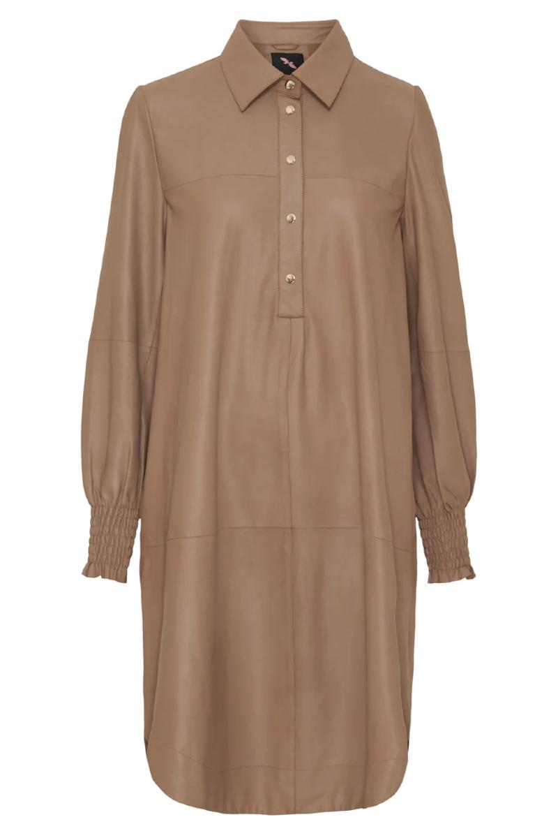 A-formet skjortekjole i deilig mykt skinn. Kjolen har skjortekrage og knappelukking øverst på kjolen foran. Har lange ermer med fine, smockede kanter i endene. Avrundet fald og dekorative sømmer.