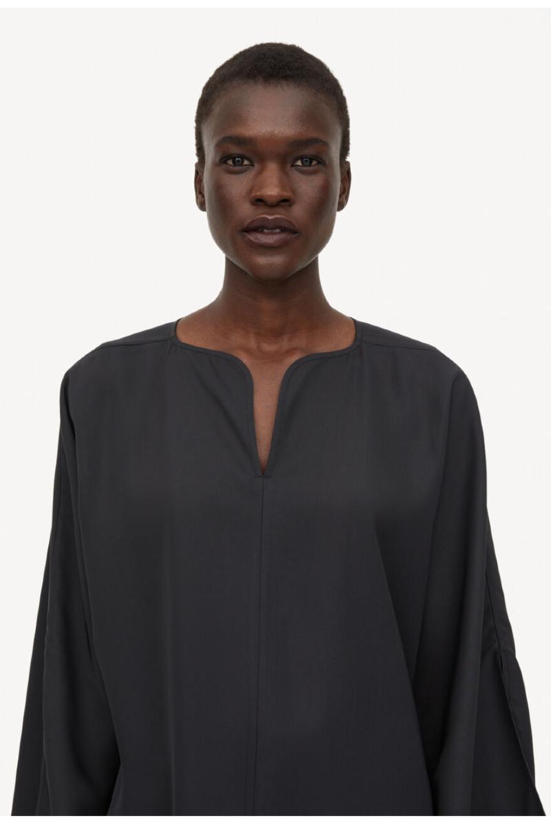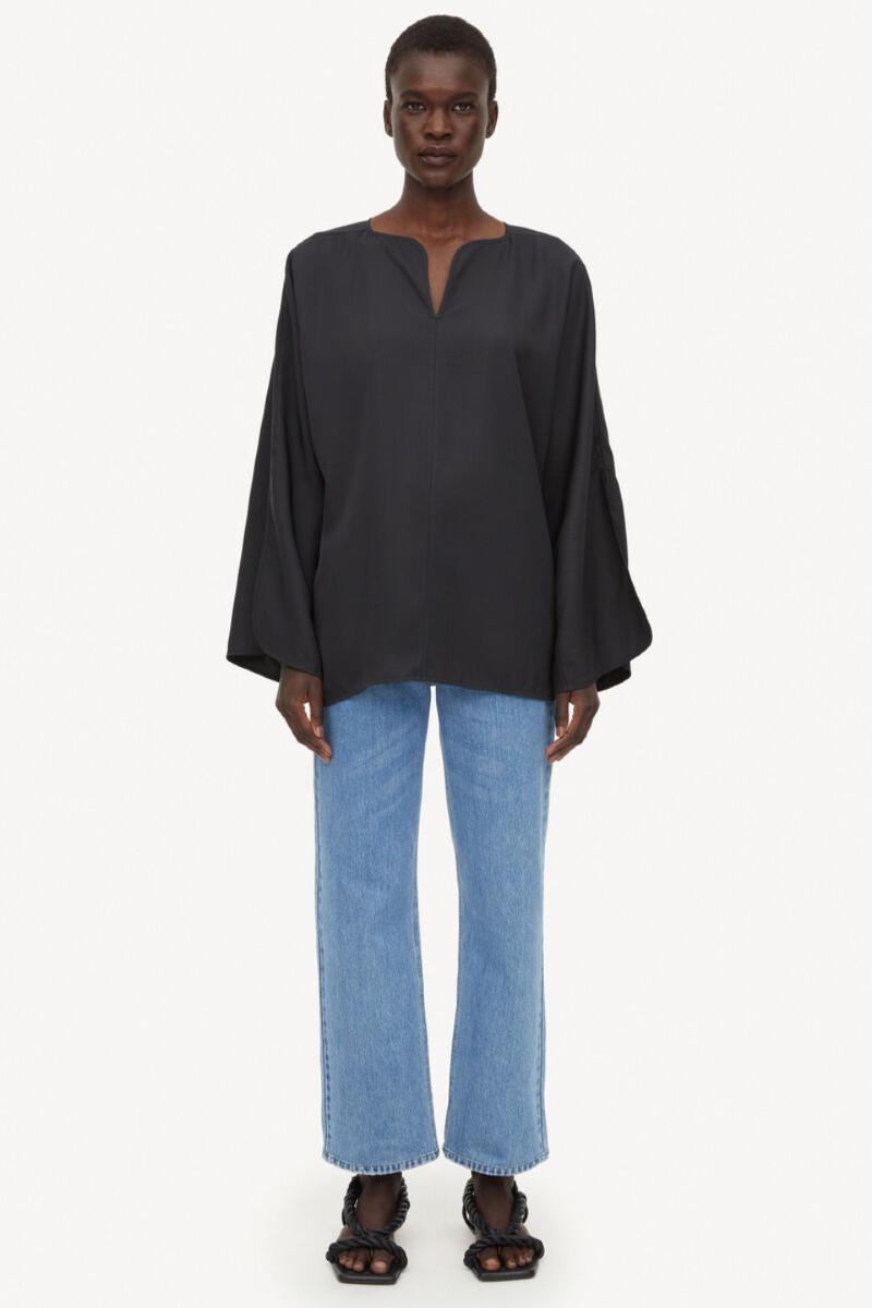 Calias-blusen er en allsidig stift fra hverdagsdressing, og er vakker i sin enkelhet. Den er skånsomt skreddersydd og myk å ta på, den har en flatterende V-formet hals, Dolman-ermer og definerende avrundede falder. Legg din inn i bukser eller jeans med vide ben.