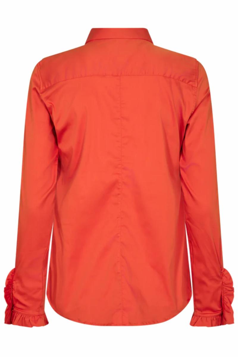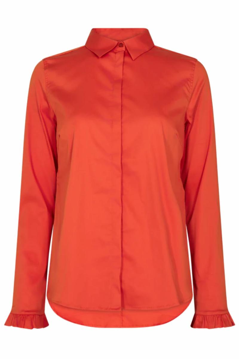 Ønsker du å sette et feminint preg på antrekket ditt? Kutt i en flatterende slank passform, laget i det mykeste elastiske stoffet med en klassisk krage, feminine volanger og klassisk knappelukking. Style den med skreddersøm og la den volangerte mansjetten titte frem fra ermene.
