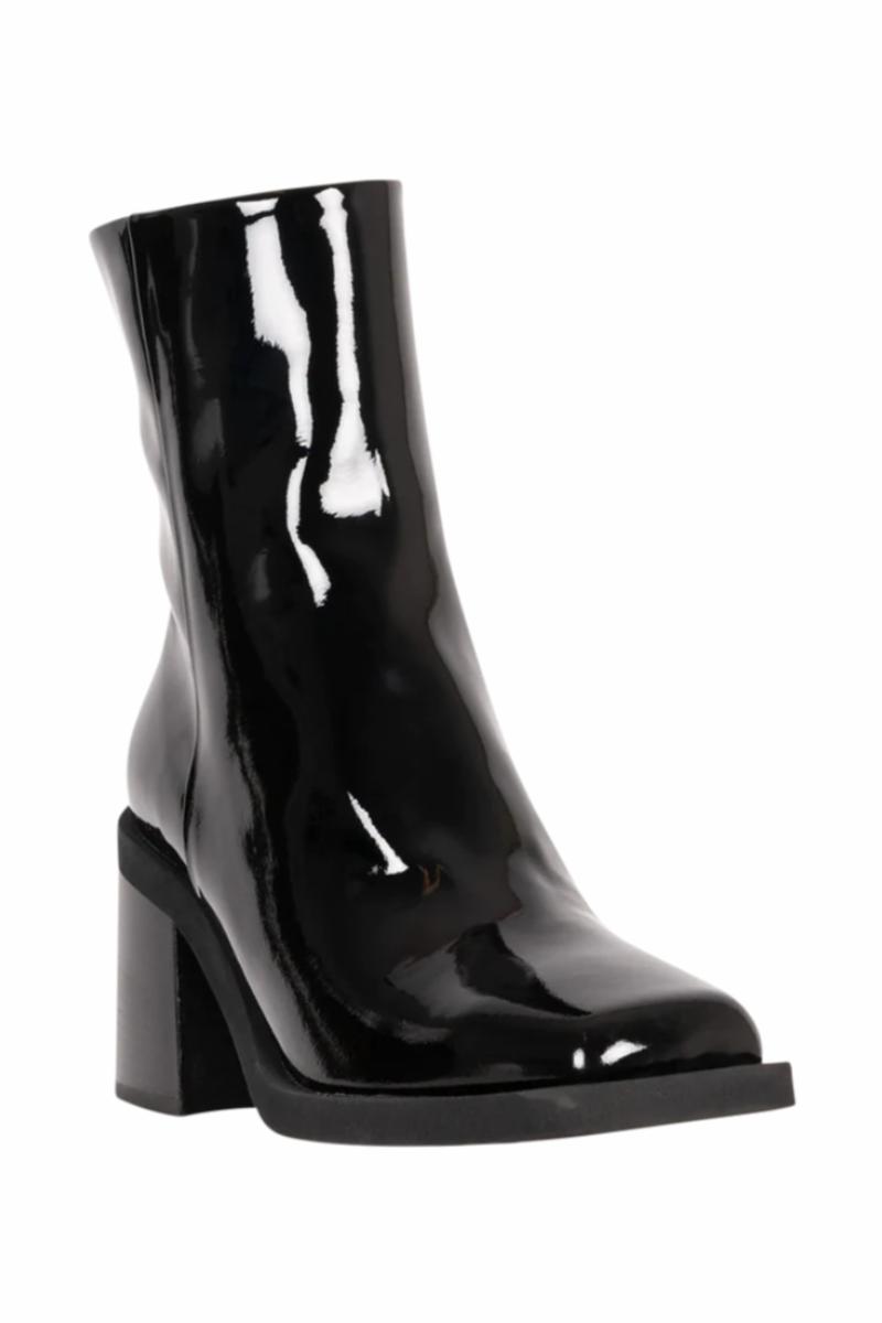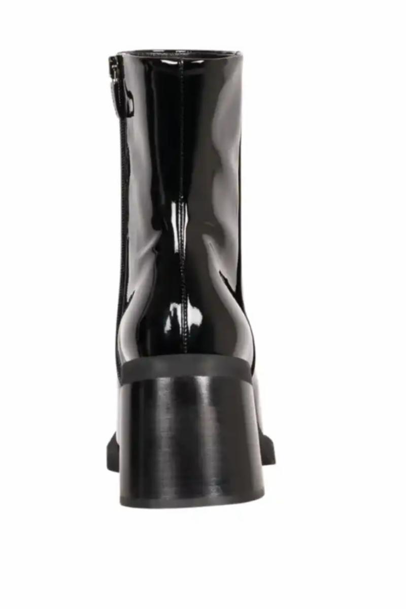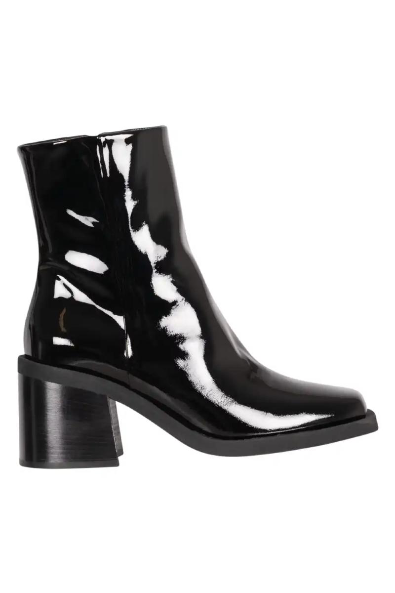 Vernice ankelstøvler fra Laura Bellariva. Disse tøffe ankelstøvlene er laget av blankt patentlær. De har et ankelhøyt skaft med glidelås på innsiden. Skoene har en solid og komfortabel blokkhæl og er god å gå i. Firkantet tå.
