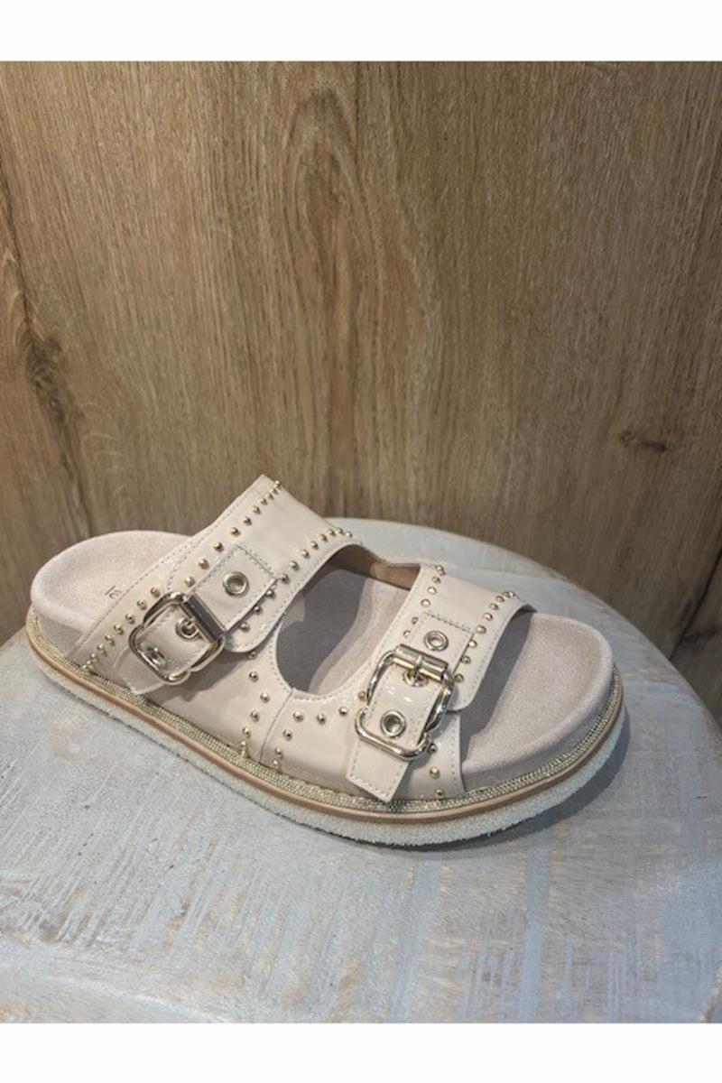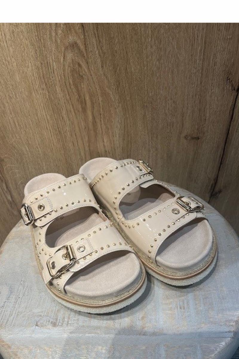 Lekker beige lakk skinn sandal med sølv studs. Justerbare remmer og en behagelig såle for nydelig komfort. Flott sandal som passer lekre antrekk til sommerfesten.